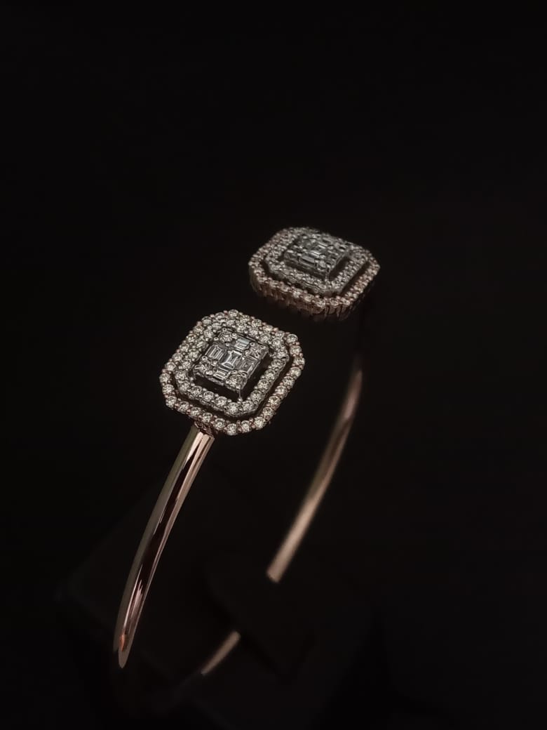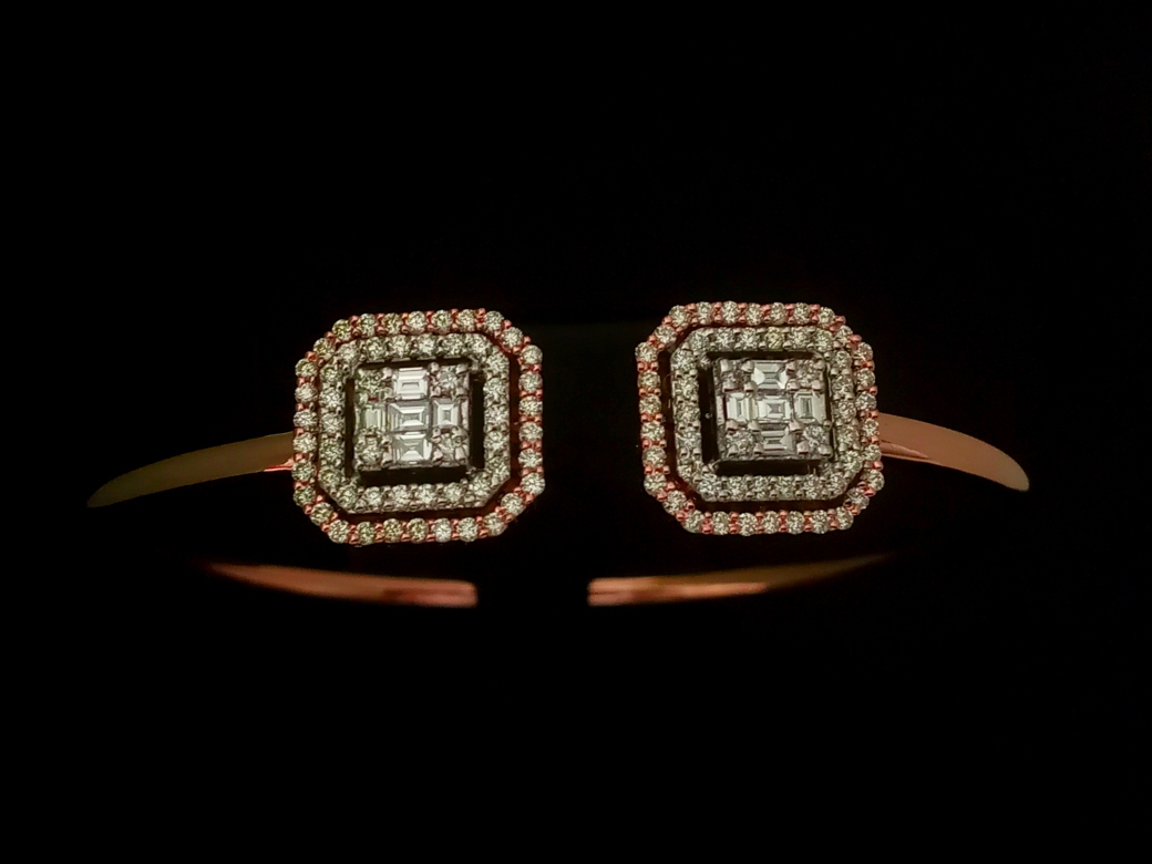 “Bling that speaks volumes 💎! 🔥 This stunning rose gold bangle with double-halo diamond squares is EVERYTHING modern & chic 💁♀️. The geometric sparkle & layered diamonds scream sophistication & edge – perfect for the bold, stylish souls in today’s fast-paced world 🌟. Slay your look, turn heads, & own the night 💃! Grab this bangle & level up your jewelry game 🔥.”