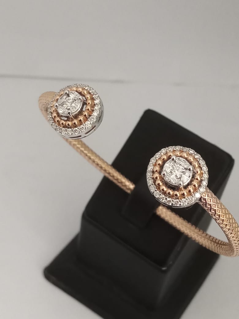 Yaaas! 🔥 This bangle tho! 😍 It’s lookin’ super luxe in rose gold with those diamond-studded circular accents 💎. The twisted rope-like design on the band adds some serious texture and swag 😎. Against that sleek black background, the whole piece is poppin’ like crazy! 💫 Looks like somethin’ you’d rock to a fancy dinner or a desi wedding 💃🏽. What do you think?