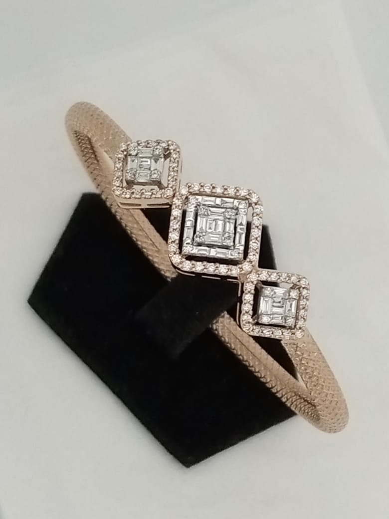 The bracelet in the image is a stunning piece of jewelry with a rose gold band and three square-shaped settings adorned with diamonds. Each setting features a central diamond surrounded by smaller diamonds, creating a beautiful and elegant design. The bracelet is displayed on a black jewelry stand against a white background, highlighting its intricate details and luxurious look. The rose gold tone gives the bracelet a warm and sophisticated appearance, making it a lovely accessory for formal or special occasions. š